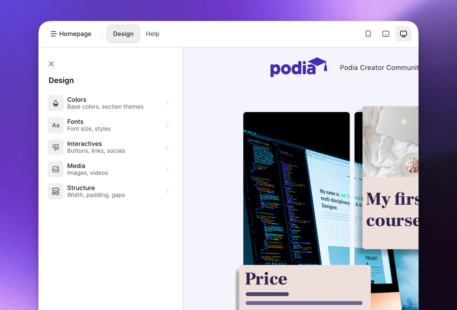 Try it yourself. Head to your Podia website builder and click on βDesignβ in the top menu to adjust your global settings.